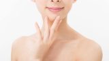 女性が鏡の前でスキンケアをしているシーン。彼女はタオルを頭に巻き、微笑みながら顔に手を当てています。背景には部屋のインテリアが見えます。